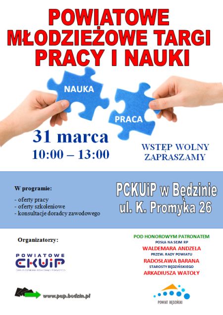 W dniu 31 marca 2015r. w godz. od 10.00 do 13.00 w siedzibie Powiatowego Cetrum Kształcenia Ustawicznego i Praktycznego w Będzinie przy ul. K. Promyka 26 odbędą się, pod honorowym patronatem Posła na Sejm RP Wlademara Andzela, Starosty Będzińskiego Arkadiusza Watoły oraz Przewodniczącego Rady Powiatu Radosława Barana, Powiatowe Młodzieżowe Targi Pracy i Nauki.