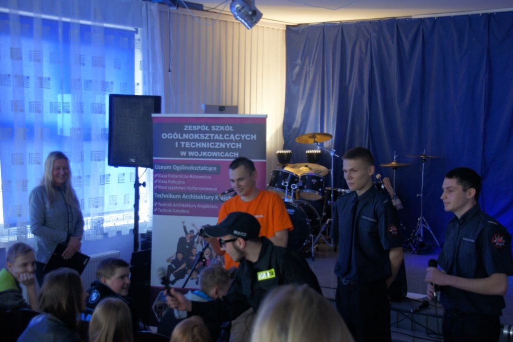 Spotkanie uświetnił swą obecnością Burmistrz Wojkowic – pan Tomasz Szczerba oraz pani Karolina Ostrowska – redaktor naczelna „Głosu Wojkowic”. Po krótkiej prezentacji specyfiki kształcenia w Liceum Ogólnokształcącym i Technikum Architektury Krajobrazu wszyscy zgromadzeni w szkolnej auli mogli obejrzeć naszych wspaniałych policjantów, dzielnych strażaków i wścibskich dziennikarzy jako aktorów debiutujących w szkolnym kabarecie. Scena zapłonęła … i sprawił to nie tylko talent aktorski naszych uczniów… Na szczęście szybka akcja strażacka i ratownicza, interwencja policyjna oraz szum zrobiony przez dziennikarzy załatwiły sprawę… Prawie… Rzeczywistością „po pożarze” zajęli się nasi przyszli architekci krajobrazu i geodeci. Wymierzyli, zaprojektowali, posadzili…I to w zaledwie 2 minuty! Na koniec nie mogło zabrzmieć nic innego niż Jak nie my, to kto – oczywiście w wykonaniu uczniów ZSOiT w Wojkowicach. Po raz kolejny okazało się, że nasza szkoła jest w stanie pomieścić w sobie i rozwinąć wiele talentów!