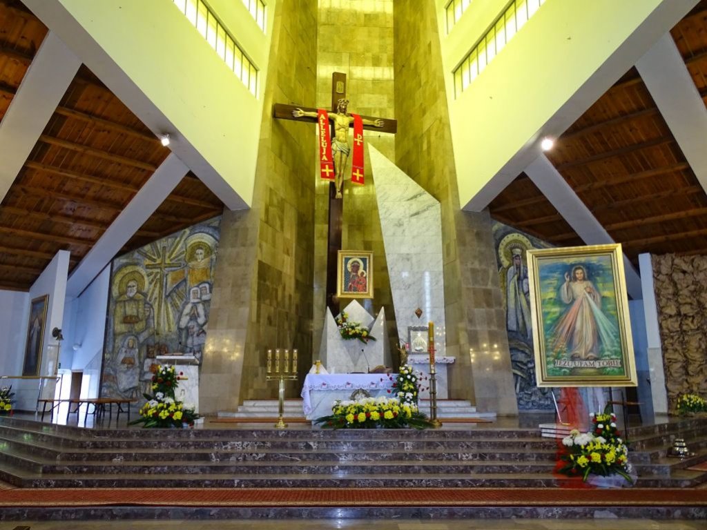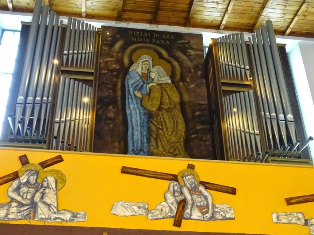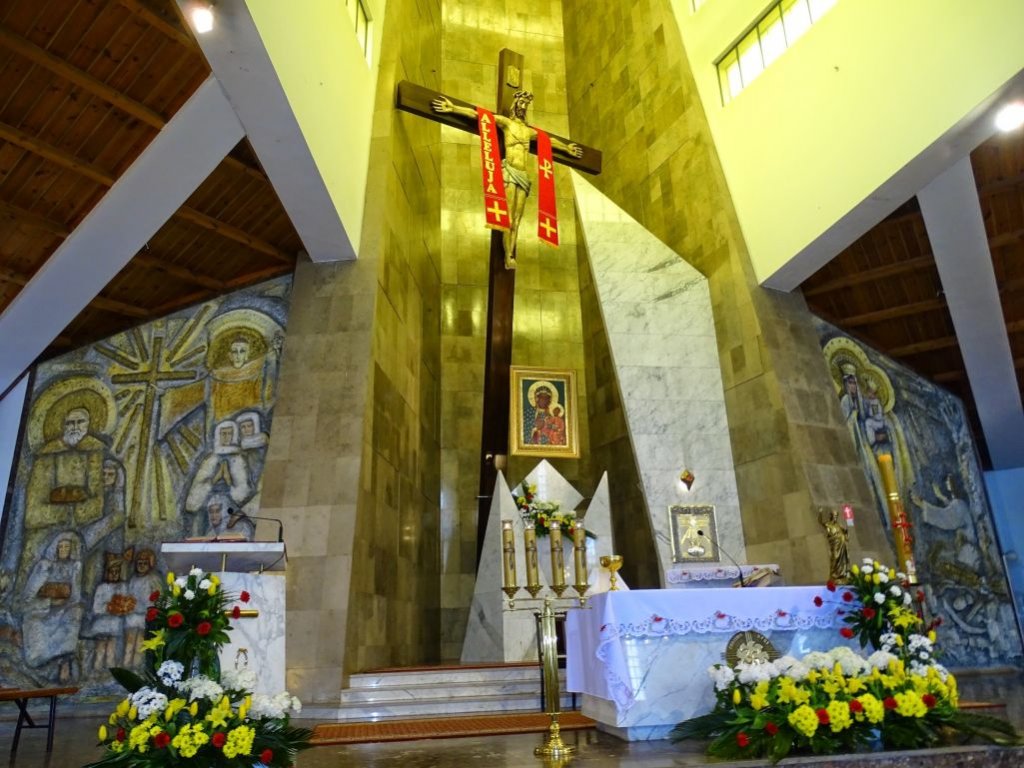 W prezbiterium górnej części kościoła został umieszczony krzyż z ponad trzymetrowym wizerunkiem Jezusa, na skrzydłach znajdują się dwie płaskorzeźby: jedna z nich to patronowie diecezji sosnowieckiej święty Brat Albert oraz święty Rafał Kalinowski, druga zaś to „Widzenie w katordze” według Artura Grottgera. Droga Krzyżowa, która swoje miejsca ma w tylnej części kościoła symbolizuje i jest zapisem męczeńskiej drogi Polski do wolności.