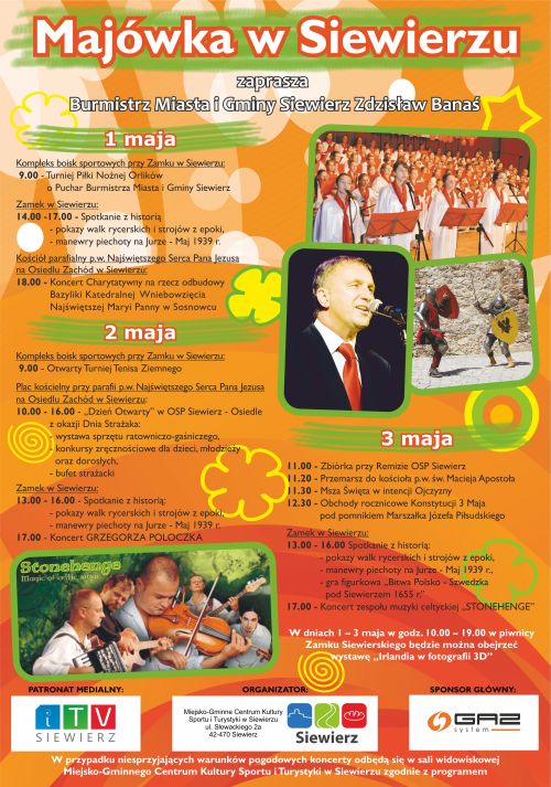 2-go Maja zapraszamy na Otwarty Turniej Tenisa Ziemnego. Każdy miłośnik tej dyscypliny sportowej będzie mógł spróbować swoich sił do czego szczerze zachęcamy. W tym dniu zapraszamy również na „Dzień Otwarty” w Ochotniczej Straży Pożarnej w Siewierzu z okazji Dnia Strażaka z licznymi atrakcjami. Zakończenie dnia upłynie pod znakiem kabaretowo – muzycznym, bowiem gwiazdą wieczoru będzie znany z kabaretu „Rak” – artysta i satyryk – Grzegorz Poloczek.