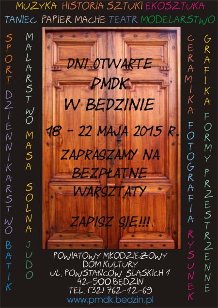 „OTWIERAMY SIĘ DLA WAS” – pod tym hasłem Powiatowy Młodzieżowy Dom Kultury w Będzinie pragnie wyjść ze swoją ofertą zajęć, warsztatów do dzieci i młodzieży z powiatu będzińskiego.