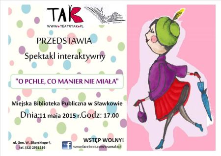 Miejska Biblioteka Publiczna w Sławkowie zaprasza w dniu 11 maja 2015r. dzieci wraz z opiekunami na interaktywne przedstawienie pt. "O pchle, co manier nie miała" w wykonaniu krakowskiego teatru TAK!