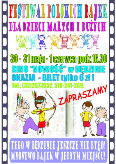 Już 30 maja w Kinie "Nowość" w Będzinie (ul. Potockiego 3) rusza Festiwal Polskich Bajek dla Dzieci Małych i Dużych. Trzy dni prawdziwej frajdy dla wszystkich miłośników polskich bajek. Każdy dzień w kinie to tylko 6 zł. od osoby.