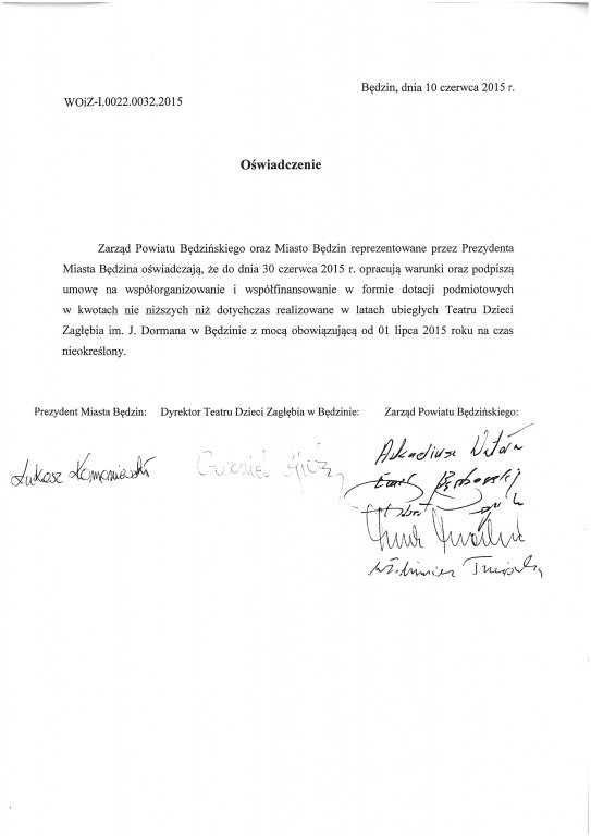 Ponadto Zarząd Powiatu Będzińskiego oraz Prezydent Miasta Będzina oświadczyli, że do dnia 30 czerwca opracują warunki oraz podpiszą umowę na współorganizowanie i współfinansowanie w formie dotacji podmiotowych Teatru Dzieci Zagłębia.