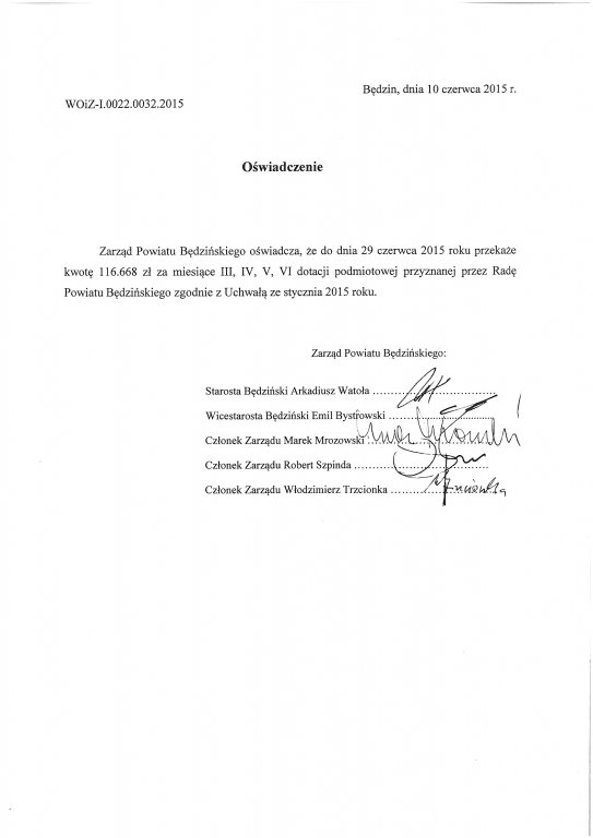 Podpisane porozumienie, pozwoli Zarządowi na przekazanie dotacji podmiotowej w wysokości 116 668 zł do dnia 29 czerwca 2015 roku.