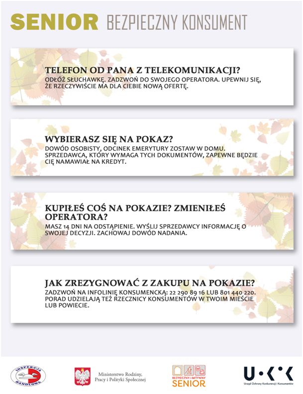 Z tej okazji Urząd Ochrony Konkurencji i Konsumentów przypomina o prawach osób starszych. – Wpływa do nas bardzo dużo skarg od konsumentów w podeszłym wieku lub ich rodzin. Te osoby są oszukiwane –ktoś podszywa się pod ich sprzedawcę prądu, zapraszane są na rzekomo bezpłatne badania, których wiarygodność jest wątpliwa. Cały czas odbywają się prezentacje drogich naczyń do gotowania. Sprawdziliśmy, że w samej Łodzi w ciągu roku odbyło się 600 pokazów w 80 hotelach! Skala jest bardzo duża - mówi Marek Niechciał, prezes Urzędu Ochrony Konkurencji i Konsumentów. – Przygotowaliśmy specjalną pomoc prawną dla tych z Państwa, którzy zostali wprowadzeni w błąd, ponieważ ktoś podszył się pod Państwa sprzedawcę prądu, gazu czy operatora telekomunikacyjnego– dodaje Niechciał.