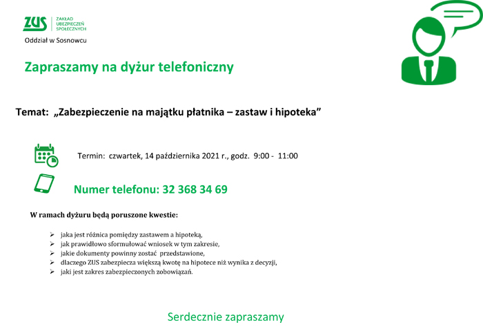 Zakład Ubezpieczeń Społecznych Oddział w Sosnowcu zachęca do skorzystania z dyżuru telefonicznego.
