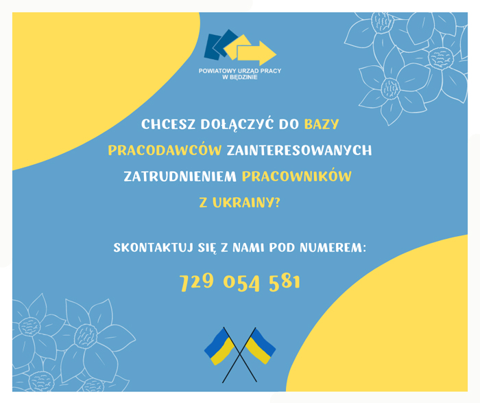 Starosta Będziński Sebastian Szaleniec zachęca wszystkich pracodawców chcących zatrudnić w swojej firmie pracownika z Ukrainy do kontaktu z Powiatowym Urzędem Pracy w Będzinie pod numerem 729 054 581.