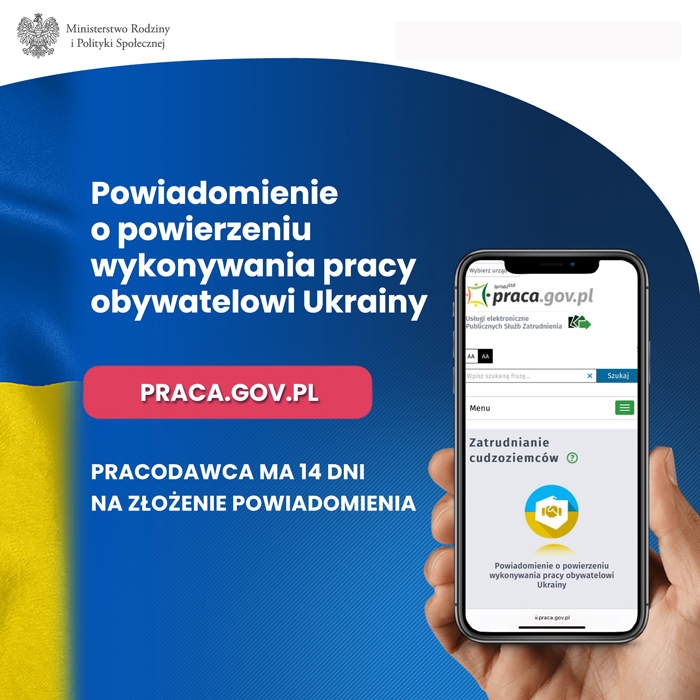 Starosta Będziński Sebastian Szaleniec informuje, że na stronie www.praca.gov.pl można już dokonywać powiadomienia o powierzeniu wykonywania pracy obywatelowi Ukrainy. Zgodnie z ustawą o pomocy obywatelom Ukrainy pracodawca ma 14 dni na dopełnienie tego obowiązku.
