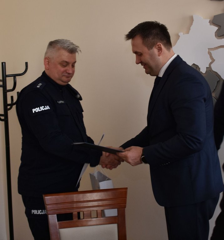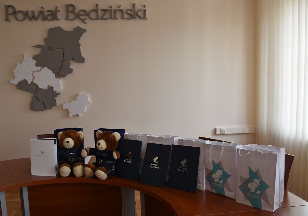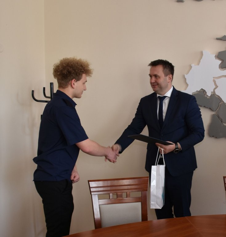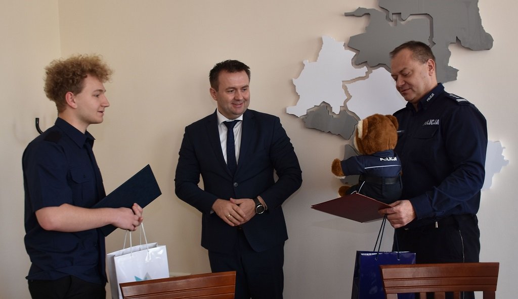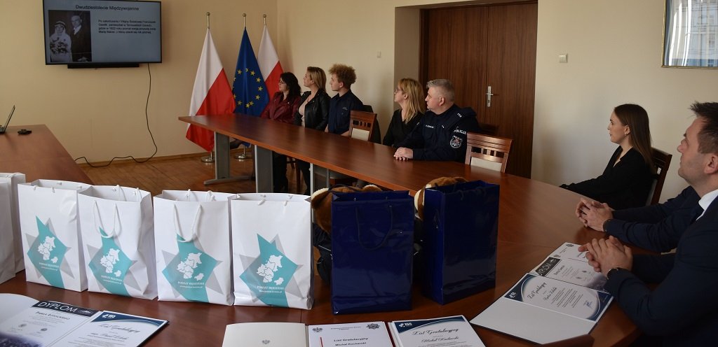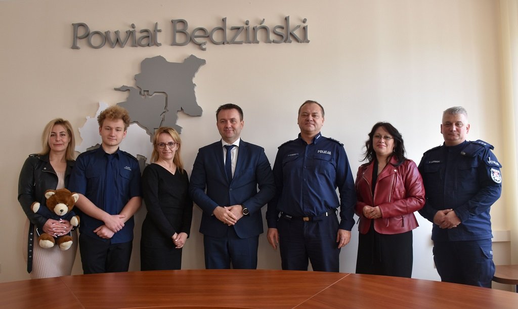 Dzisiaj o godzinie 9.00 w budynku Starostwa Powiatowego w Będzinie odbyło się uroczyste nagrodzenie uczniów klasy policyjnej Zespołu Szkół Ogólnokształcących i Technicznych w Wojkowicach. Starosta Będziński Sebastian Szaleniec wraz z Komendantem Komendy Powiatowej Policji w Będzinie insp. Arkadiuszem Więckiem wręczyli wyróżnienia dla uczniów w imieniu Komendanta Głównego Policji gen. insp. dr Jarosława Szymczyka oraz Prezesa Instytutu Pamięci Narodowej Jarosława Szarka.