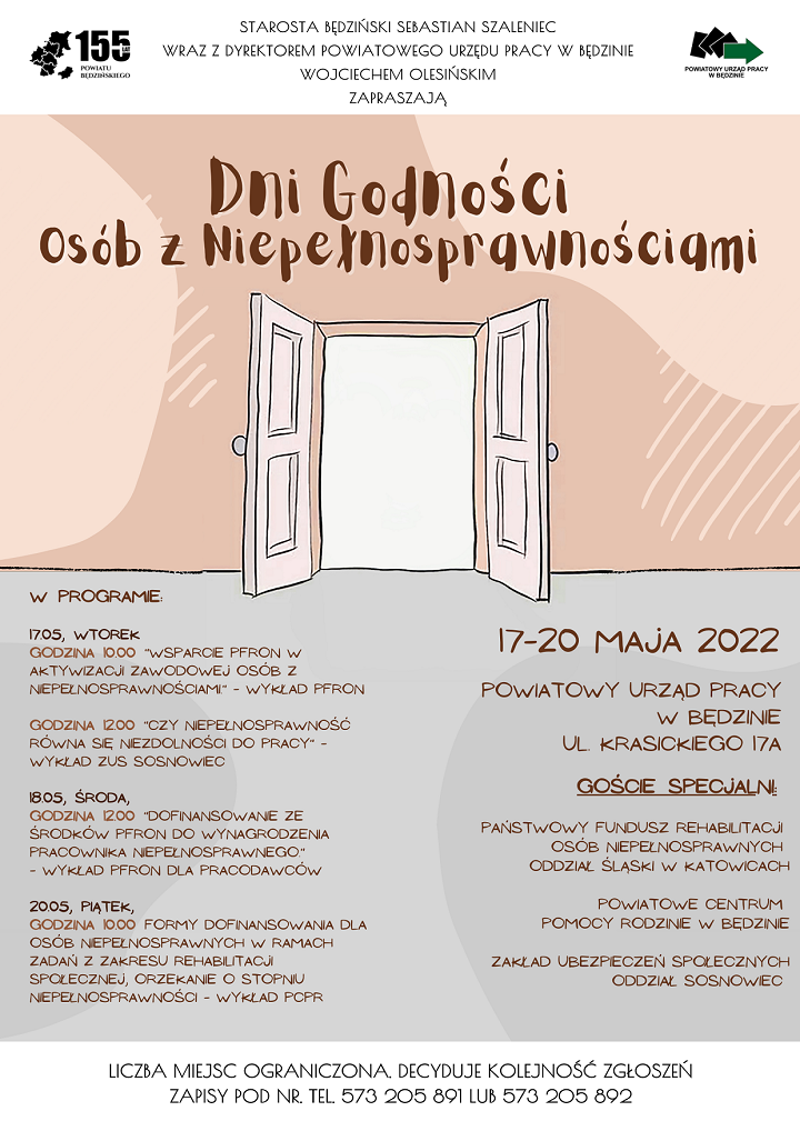 Starosta Będziński Sebastian Szaleniec wraz z Dyrektorem Powiatowego Urzędu Pracy w Będzinie Wojciechem Olesińskim serdecznie zapraszają wszystkich zainteresowanych na wykłady z okazji Dni Godności Osób z Niepełnosprawnościami, które odbędą się od 17 do 20 maja 2022. W programie prelekcje zarówno dla pracodawców chcących zatrudniać osoby z niepełnosprawnościami jak i porady z zakresu rehabilitacji społecznej, czy też orzekania o stopniu niepełnosprawności.