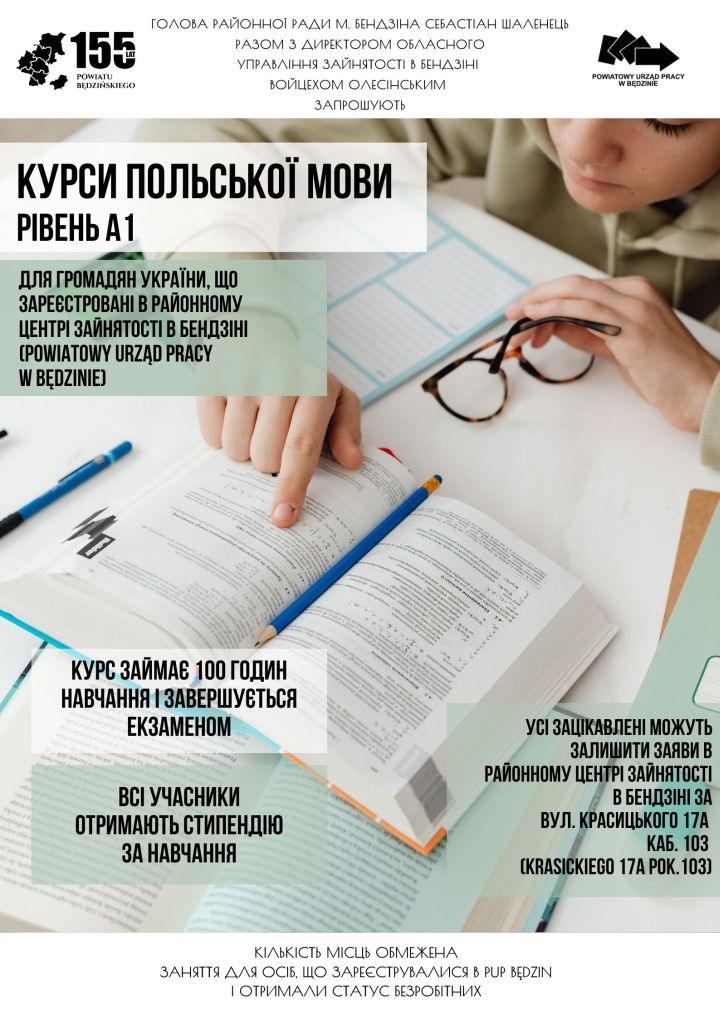 Голова Районної Ради м. Бендзіна Себастіан Шаленець разом з директором Районного Центру Зайнятості в Бендзіні Войцехом Олесінським щиро запрошують громадян України, зареєстрованих в PUP Będzin як безробітних, на курси польської мови на рівні А1