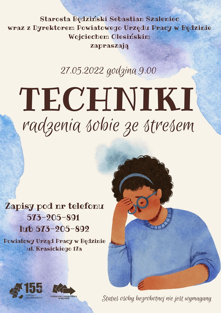 Starosta Będziński Sebastian Szaleniec wraz z Dyrektorem Powiatowego Urzędu Pracy w Będzinie Wojciechem Olesińskim serdecznie zapraszają wszystkich zainteresowanych na wykład „Techniki radzenia sobie ze stresem,”, który odbędzie się 27 maja 2022 o godzinie 9.00 w Powiatowym Urzędzie Pracy w Będzinie przy ul. Krasickiego 17a.