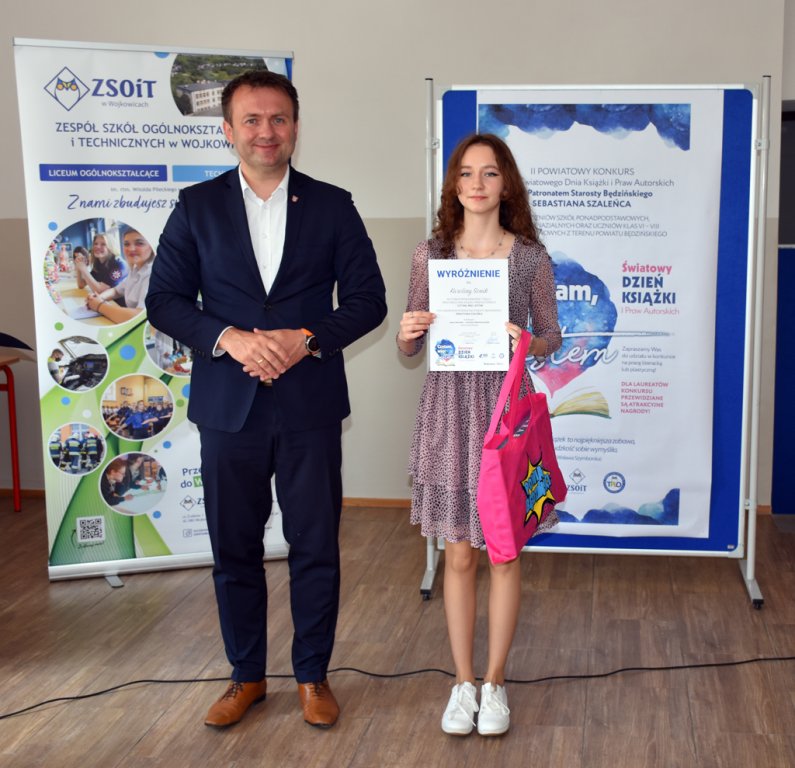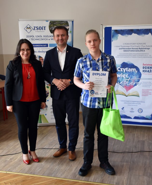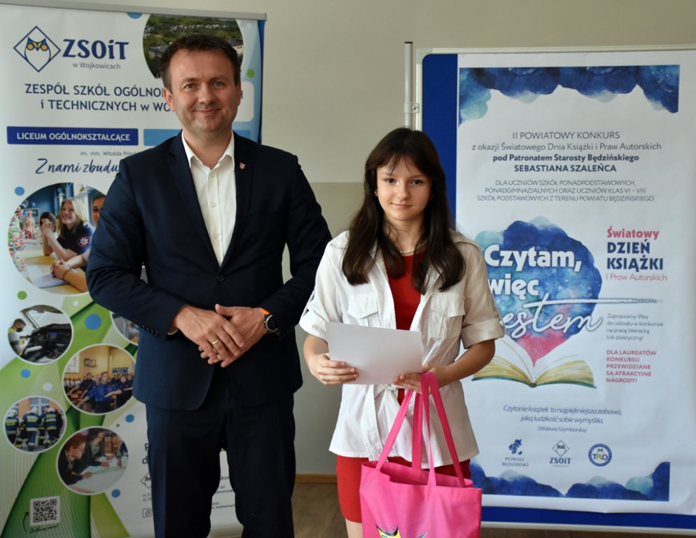 Dzisiaj Starosta Będziński – Sebastian Szaleniec na zaproszenie Dyrektor Zespołu Szkół Ogólnokształcących i Technicznych w Wojkowicach – Justyny Pitas uczestniczył w uroczystym podsumowaniu II Powiatowego Konkursu z okazji Światowego Dnia Książki i Praw Autorskich – „Czytam, więc jestem”, na pracę literacką lub plastyczną. Komisja konkursowa była pełna uznania dla twórczości utalentowanej młodzieży i w wyniku obrad wyłoniła tegorocznych zwycięzców w dwóch kategoriach wiekowych – szkół podstawowych i ponadpodstawowych. Laureatom zostały wręczone nagrody.