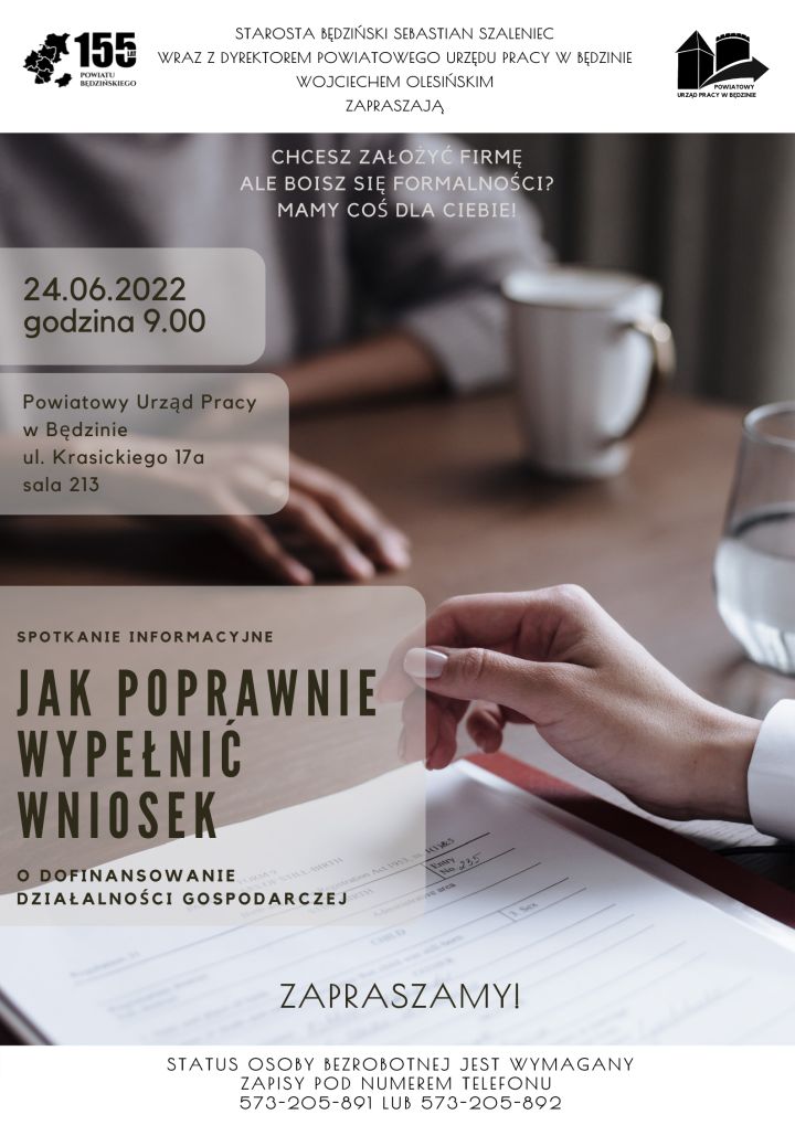 Starosta Będziński Sebastian Szaleniec wraz z Dyrektorem Powiatowego Urzędu Pracy w Będzinie Wojciechem Olesińskim serdecznie zapraszają wszystkich zainteresowanych na spotkanie informacyjne „Jak poprawnie wypełnić wniosek o dofinansowanie działalności gospodarczej, ” które odbędzie się 24 czerwca 2022 o godzinie 9.00 w Powiatowym Urzędzie Pracy w Będzinie przy ul. Krasickiego 17a w Sali 213