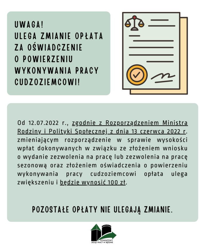 Od 12.07.2022 r. wchodzi w życie Rozporządzenie Ministra Rodziny i Polityki Społecznej z dnia 13 czerwca 2022 r. zmieniające rozporządzenie w sprawie wysokości wpłat dokonywanych w związku ze złożeniem wniosku o wydanie zezwolenia na pracę lub zezwolenia na pracę sezonową oraz złożeniem oświadczenia o powierzeniu wykonywania pracy cudzoziemcowi. Nowa kwota opłaty to 100 zł – w przypadku gdy podmiot powierzający wykonywanie pracy cudzoziemcowi zamierza powierzyć wykonywanie pracy na podstawie oświadczenia o powierzeniu wykonywania pracy cudzoziemcowi wpisanego do ewidencji oświadczeń. Wysokości wpłat dokonywanych w związku ze złożeniem wniosku o wydanie zezwolenia na pracę sezonową nie ulegają zmianie.