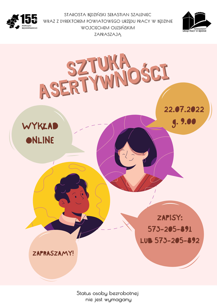Starosta Będziński Sebastian Szaleniec wraz z Dyrektorem Powiatowego Urzędu Pracy w Będzinie Wojciechem Olesińskim serdecznie zapraszają wszystkich zainteresowanych na wykład online „Sztuka asertywności,”, który odbędzie się 22 lipca 2022 o godzinie 9.00 w Powiatowym Urzędzie Pracy w Będzinie przy ul. Krasickiego 17a.