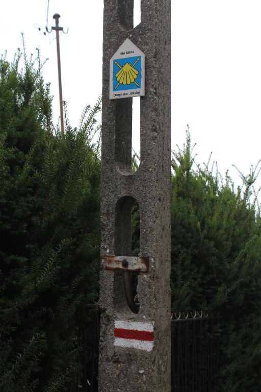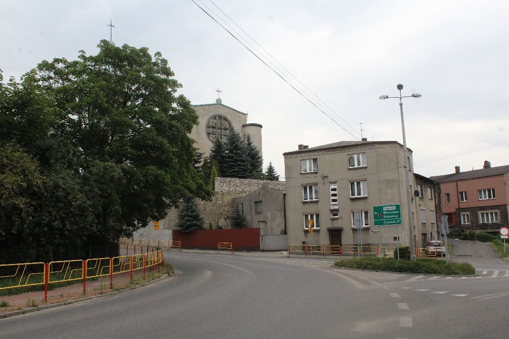 Za cmentarzem – skręcamy w prawo, wzdłuż placu zabaw na Górze Zamkowej. Dla tych, którzy chcą zrobić sobie przerwę na krótki odpoczynek (długa droga jeszcze przed nami!) pojawia się kilka możliwości: do wyboru ławki przy placu zabaw, bądź w parku, do którego zaraz dojdziemy. Szlak w wielu miejscach pokrywa się ze szlakiem Via Regia, obok naszego znaku czerwonego, od teraz pojawiać się będzie charakterystyczna muszla, oznaczająca szlaki Drogi św. Jakuba, prowadzące do Santiago de Compostela w Hiszpanii. Idziemy wzdłuż Domu Parafialnego, po lewej stronie zostawiamykościół pw. św.Trójcy. Wzmianki o parafii będzińskiej znajdujemy już w dokumentach z pierwszej połowy XIII w., a w XIX w. świątynię ponownie rozbudowywano i przekształcono. W latach 2013-2015 przeprowadzono prace budowlane mające na celu zabezpieczenie świątyni. Obiekt znajduje się w rejestrze zabytków województwa śląskiego.