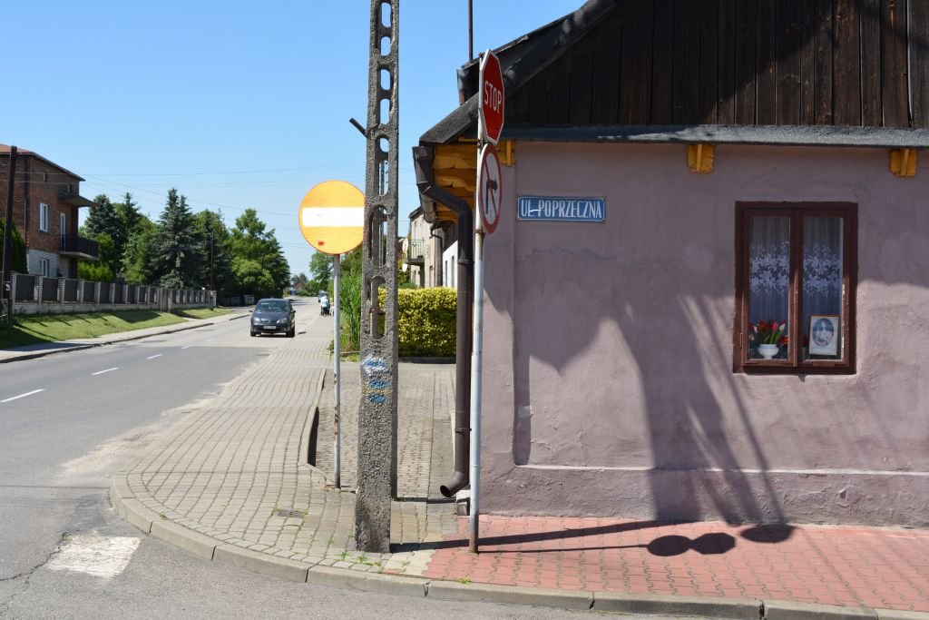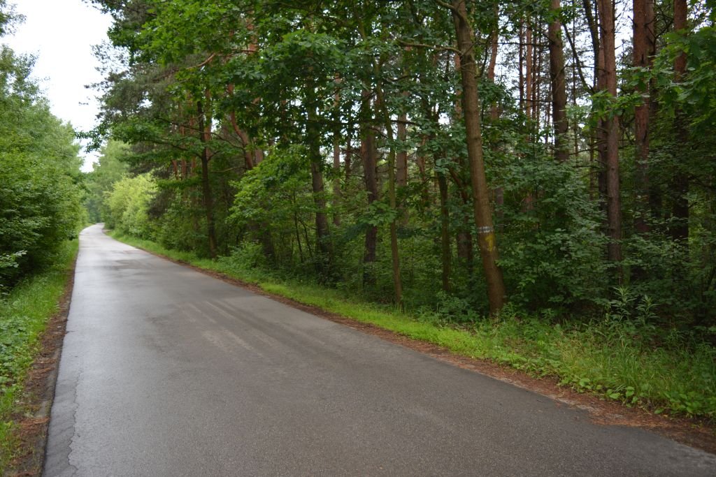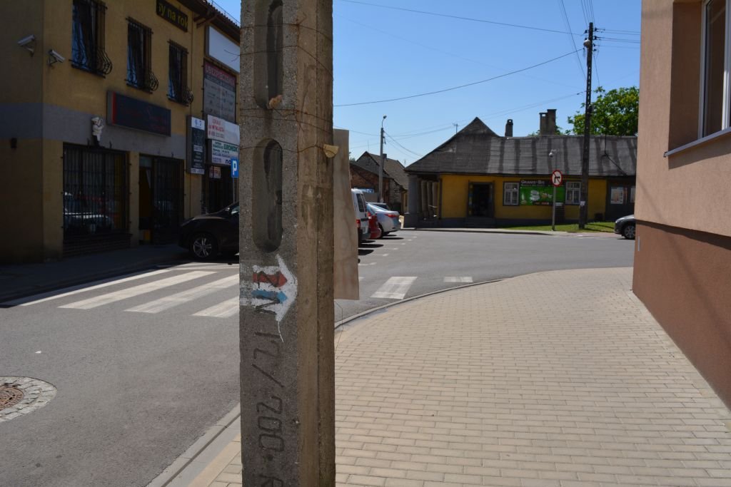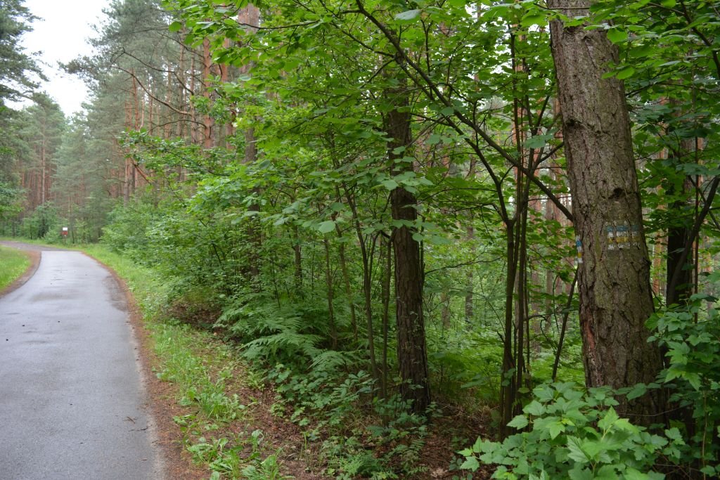 Szlak prowadzi w stronę cmentarza, następnie w lewo ulicą Obrońców Westerplatte, aż do torów kolejowych. Kolejnym charakterystycznym obiektem jest zniszczony i zdewastowany budynek dworca kolejowego. Prowadzi wzdłuż torów kolejowych w stronę przejazdu kolejowego, przekracza go, a następnie skręca w prawo w ulicę Zagródki, biegnącą wzdłuż torów kolejowych. W tym miejscu szlak jest bardzo słabo widoczny, w wielu miejscach drogę trzeba wybierać intuicyjnie. Uwaga! Istnieje tu ryzyko błędnego odczytania zniszczonego znaku i skierowania się prosto, w stronę domków jednorodzinnych (ulica Świerkowa, Konarowa, Jałowcowa).