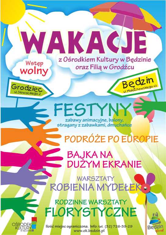 „Podróże po Europie", warsztaty robienia mydełek, bajka na dużym ekranie, rodzinne warsztaty florystyczne, zajęcia ze szkołą tańca Extreme, festyny w dzielnicach – to propozycje na spędzenie wakacji z będzińskim Ośrodkiem Kultury.