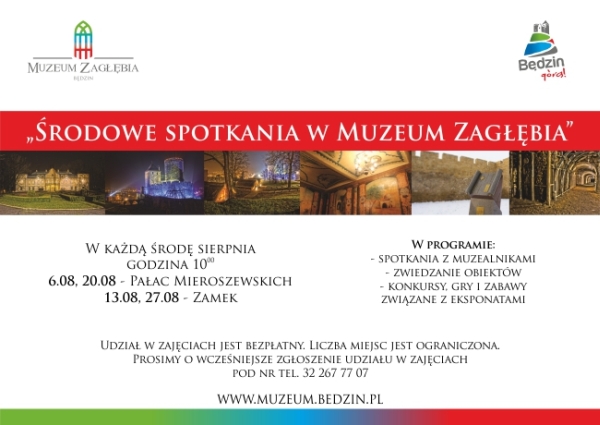 Serdecznie zapraszamy na Środowe Spotkania Muzealne. Zajęcia odbywają się w Pałacu Mieroszewskich oraz będzińskim Zamku w każdą środę sierpnia.