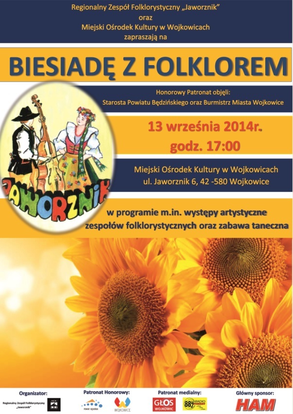 Biesiada z folklorem odbywa się pod honorowym patronatem Starosty Będzińskiego - Krzysztofa Malczewskiego oraz Burmistrza Miasta Wojkowice – Zofii Gajdzik. Wydarzenie objęli patronatem medialnym Radio Piekary oraz lokalny dwumiesięcznik Głos Wojkowic. Głównym Sponsorem imprezy są Zakłady Mięsne HAM.