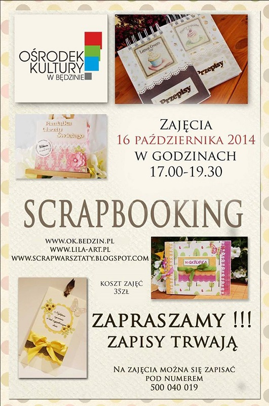 Ruszają właśnie zapisy na warsztaty ze scrapbookinkgu. Jeśli chcesz wykonać dla siebie - lub dla kogoś - oryginalny prezent w postaci pięknych, niepowtarzalnych albumów, notatników, kartek i innych praktycznych gadżetów, przyjdź na zajęcia do Ośrodka Kultury w Będzinie (ul. Małachowskiego 43). Pierwsze warsztaty już w czwartek 16 października w godzinach 17:00 - 19:30. Zapisy pod numerem telefonu: 500 040 019. Koszt: 35 zł.