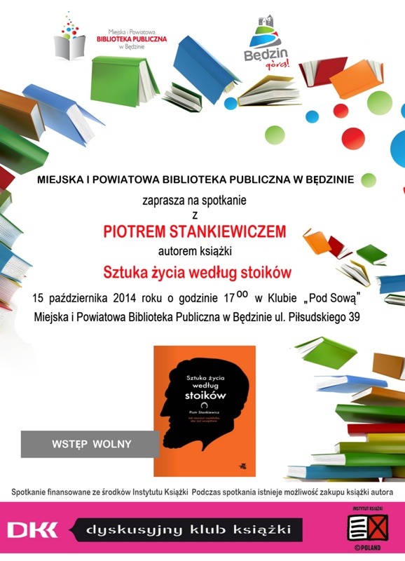 Miejska i Powiatowa Biblioteka Publiczna w Będzinie zaprasza 15 października 2014 r. o godzinie 17.00 na spotkanie z Piotrem Stankiewiczem, poetą i filozofem, autorem książki „Sztuka życia według stoików".
