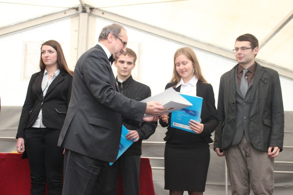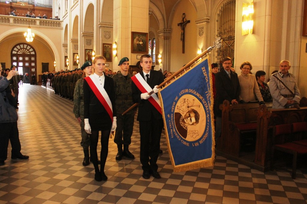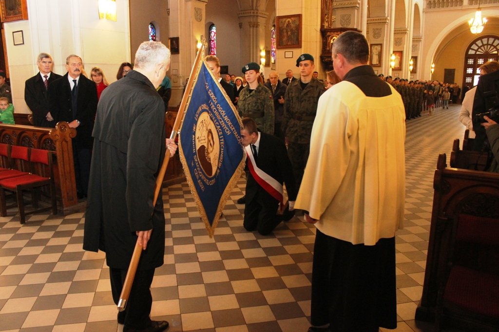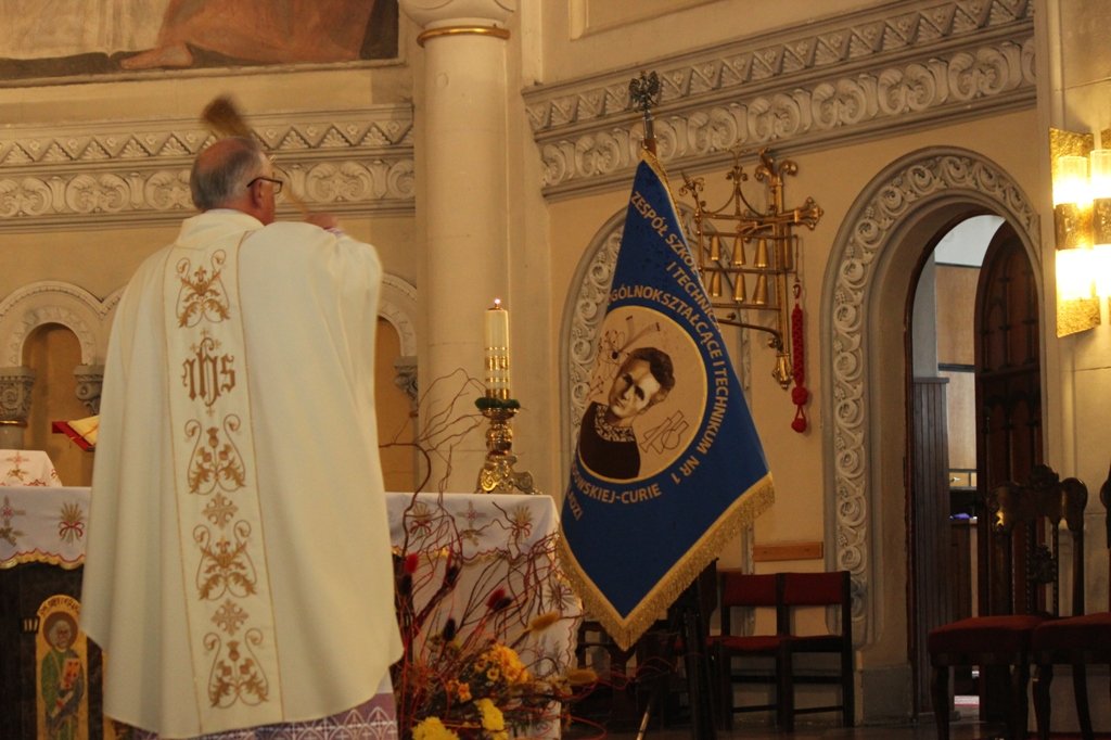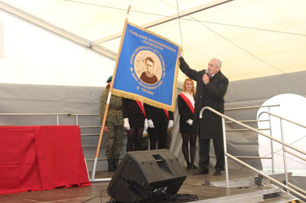 Wszystko rozpoczęło się jak najbardziej na poważnie i bardzo uroczyście. O godz. 10:30, przy dźwiękach Orkiestry Reprezentacyjnej Policji Województwa Śląskiego, młodzież z klas mundurowych przedefilowała ulicami miasta do kościoła pw. św. Stanisława BM. W trakcie uroczystej mszy proboszcz parafii ks. kan. Jarosław Wolski dokonał poświęcenia sztandaru Zespołu Szkół Ogólnokształcących i Technicznych w Czeladzi. Piękny sztandar z wizerunkiem jego patronki – Marii Skłodowskiej – Curie od tego dnia będzie towarzyszył społeczności szkolnej w trakcie najważniejszych wydarzeń.