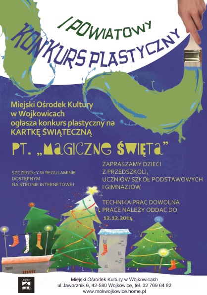 Kartki Bożonarodzeniowe są jednym z tradycyjnych elementów świątecznej atmosfery. Tym bardziej wykonane samodzielnie nabierają szczególnej wartości. Są dowodem pamięci i życzliwości ze strony najbliższych. Dlatego też, organizatorzy konkursu liczą na duże zainteresowanie oraz kreatywność w podejściu do tematu. Konkurs jest skierowany do przedszkolaków, uczniów szkół podstawowych, gimnazjów oraz uczestników zajęć plastycznych w placówkach oświatowych i kulturalnych. Organizatorzy wybiorą najlepsze prace w czterech kategoriach wiekowych, biorąc pod uwagę staranność wykonania, zgodność z tematem i pomysłowość młodych artystów. Pomysły można przedstawiać w jakiejkolwiek technice plastycznej, malując, rysując, wyklejając, a nawet próbując swoich sił w grafice komputerowej. Każdy uczestnik może przygotować tylko jedną pracę. Można je składać osobiście lub dostarczyć pocztą na adres Miejskiego Ośrodka Kultury w Wojkowicach. Na gotowe realizacje czekamy do 12 grudnia, prace nadesłane po terminie nie będą brane pod uwagę.