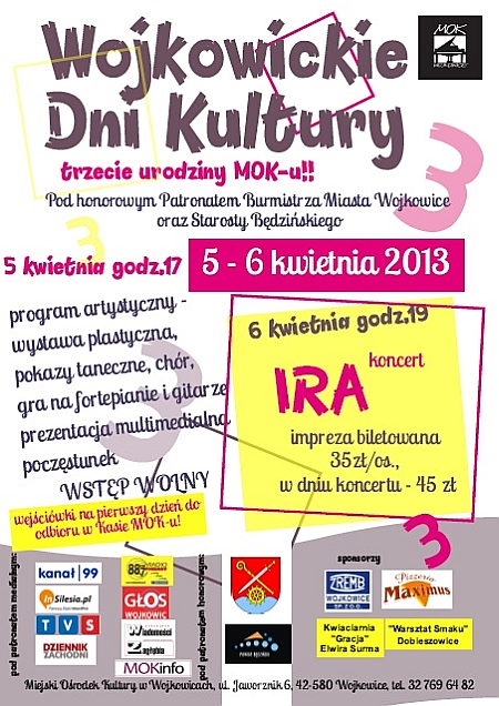 Już po raz trzeci odbędą się Wojkowickie Dni Kultury. W ramach tej trwającej dwa dni imprezy, organizator - Miejski Ośrodek Kultury w Wojkowicach, świętuje kolejny rok działalności. Corocznie WDK nawiązują bowiem do znaczącej daty - 1 kwietnia 2010 r. Od tego dnia MOK prowadzi swą działalność jako samorządowa instytucja kultury.