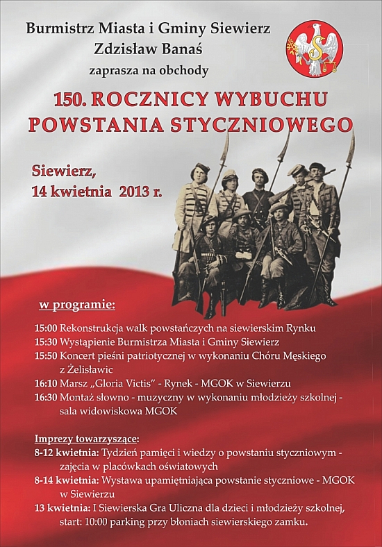 Burmistrz Miasta i Gminy Siewierz zaprasza na obchody 150. rocznicy wybuchu Powstania Styczniowego. Uroczystość odbędzie się 14 kwietnia 2013 roku. W programie między innymi: rekonstrukacja walk powstańczych na siewierskim Rynku.