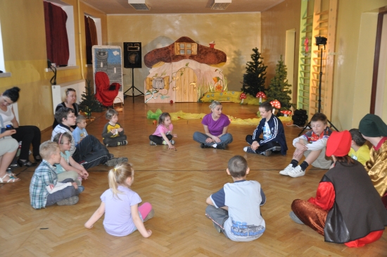 Po zakończeniu spektaklu, który został przyjęty gromkimi brawami odbyły się warsztaty artystyczne. Warsztaty obejmowały zajęcia plastyczne oraz rytmiczne. Każdy z uczestników otrzymał gotowy szablon czapki krasnoludka, który według własnego pomysłu ozdabiał przygotowanymi materiałami. W trakcie warsztatów rytmicznych, dzięki dobrze dobranej muzyce, dzieci rozpoznawały i interpretowały ruchem dźwięki przyrody oraz odgłosy dnia codziennego. Wspólna zabawa i pozytywne emocje, które towarzyszyły uczestnikom w trakcie warsztatów, wspaniale ich zintegrowały oraz wpłynęły na budowanie pozytywnych relacji.