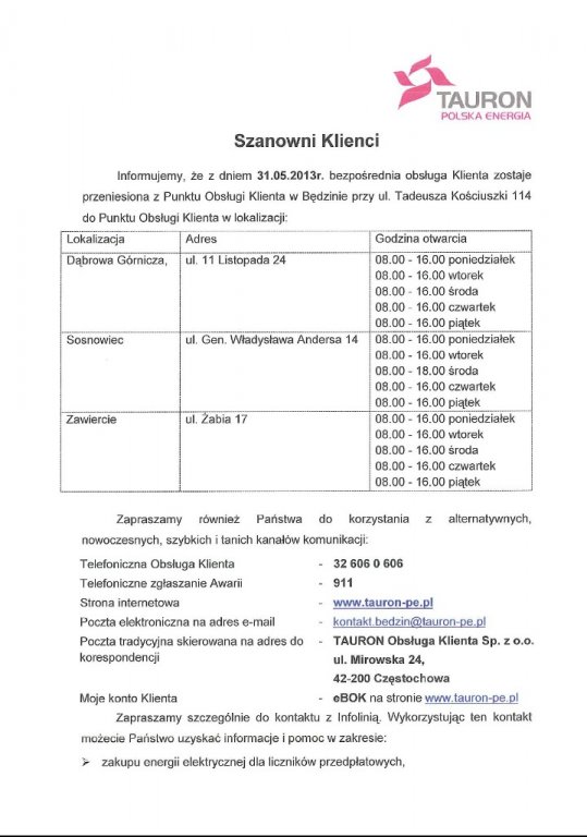 Komunikat TAURON Polska Energia, dotyczący zmian w zakresie terytorialnej obsługi klienta.
