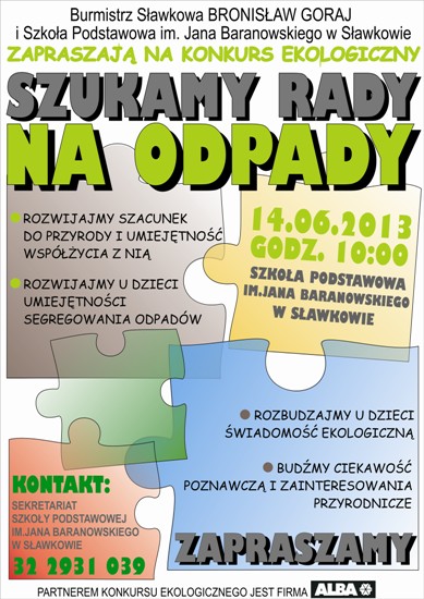 „Szukamy rady na odpady” – pod takim hasłem 14 czerwca w SP im. J. Baranowskiego w Sławkowie odbędzie się konkurs ekologiczny, którego celem jest rozwijanie u dzieci szacunku do przyrody i świadomości ekologicznej.
