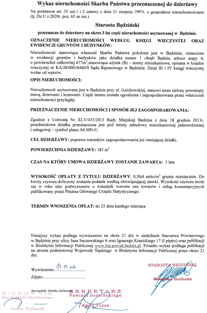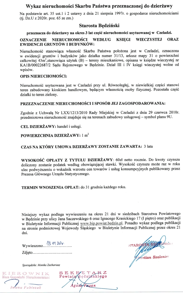 1.Niniejszy wykaz podlega wywieszeniu na okres 21 dni w siedzibach Starostwa Powiatowego w Będzinie przy ulicy Jana Sączewskiego 6 oraz Ignacego Krasickiego 17 (I piętro) oraz publikacji na stronach internetowych Starostwa Powiatowego w Będzinie.
