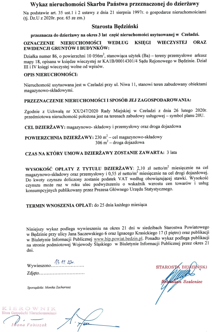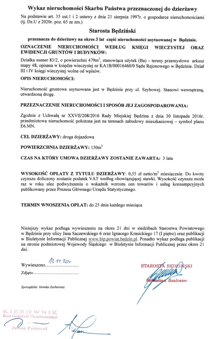 2. Niniejszy wykaz podlega wywieszeniu na okres 21 dni w siedzibie Starostwa Powiatowego w Będzinie przy ul. Krasickiego 17 oraz publikacji w Biuletynie Informacji Publicznej www.bip.powiat.bedzin.pl. Ponadto wykaz podlega publikacji na stronie podmiotowej Wojewody Śląskiego w Biuletynie Informacji Publicznej przez okres 21 dni. od 04.12.2020 r. do 28.12.2020 r.