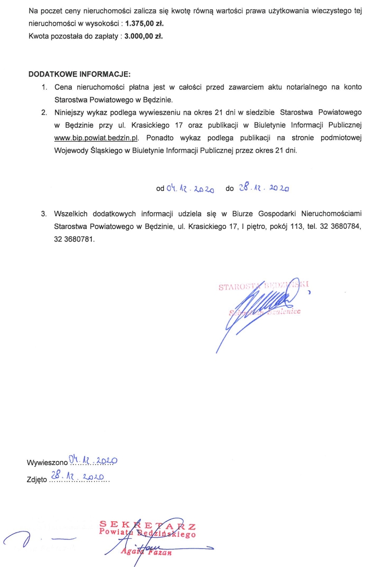 3. Wszelkich dodatkowych informacji udziela się w Biurze Gospodarki Nieruchomościami Starostwa Powiatowego w Będzinie, ul. Krasickiego 17, I piętro, pokój 113, tel. 32 3680784, 32 3680781.