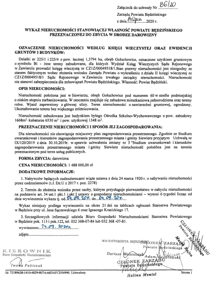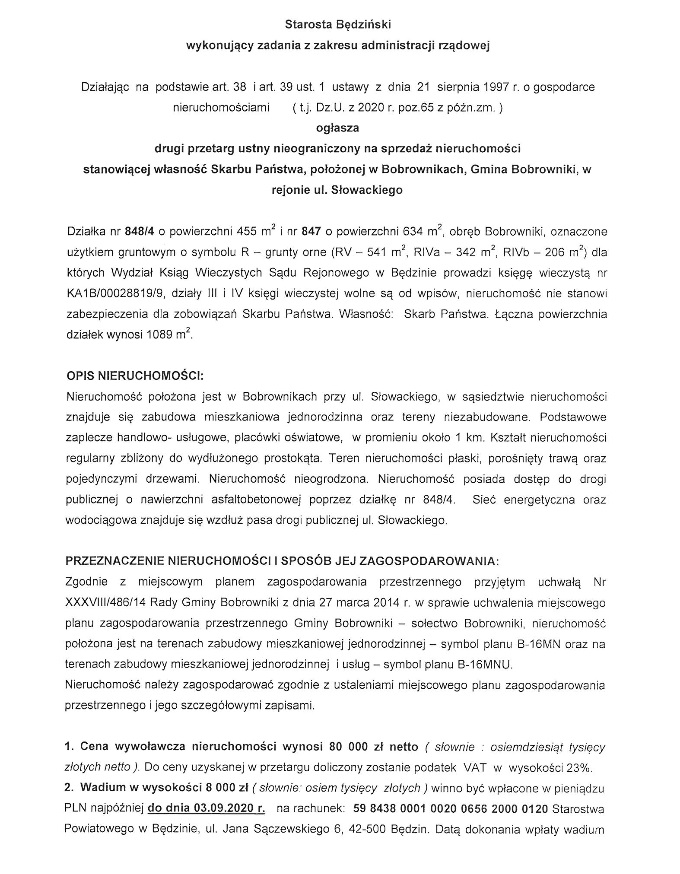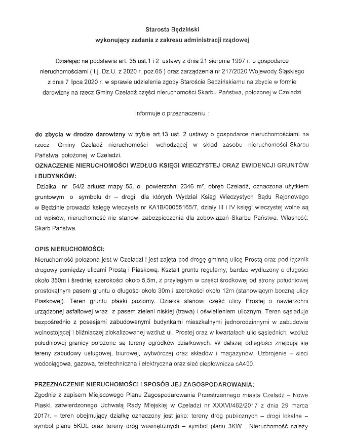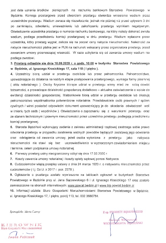 od dnia ukazania się niniejszego ogłoszenia, tj. od dnia 31 lipca 2020 r., do siedziby Starostwa Powiatowego w Będzinie przy ul. Jana Sączewskiego 6 lub ul. Ignacego Krasickiego 17, celem udokumentowania swojego prawa do przedmiotowej nieruchomości.