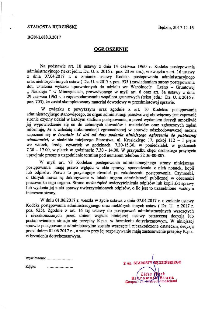 Starosta Będziński, wykonujący zadania z zakresu administracji rządowej, działając na podstawie art. 61 § 1 i § 4 oraz art. 49 ustawy z dnia 14.06.1960 r. Kodeks postępowania administracyjnego (tekst jedn. Dz. U. z 2017 r. poz. 1257) w związku z art. 23 ustawy z dnia 10.04.2003 r. o szczególnych zasadach przygotowania i realizacji inwestycji w zakresie dróg publicznych (tekst jedn. Dz. U. z 2017 r. poz. 1496) i art. 113 ust. 7 ustawy z dnia 21.08.1997 r. o gospodarce nieruchomościami (tekst jedn. Dz. U. z 2016 r. poz. 2147