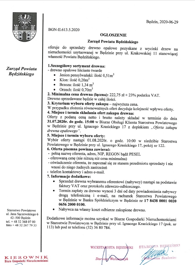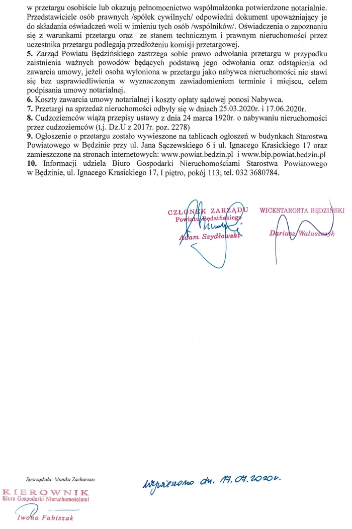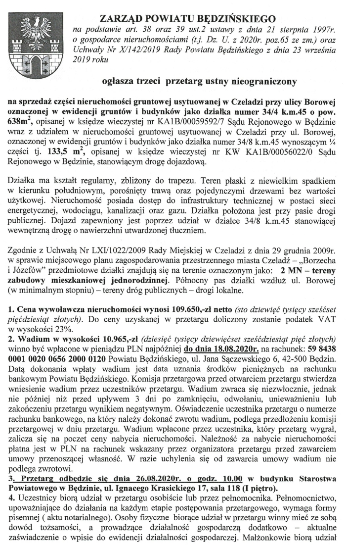 Obwieszczenie wywiesza się od dnia 29.06.2020 r. na okres 14 dni na tablicy ogłoszeń Starostwa Powiatowego w Będzinie, obwieszcza się w innej formie publicznego ogłoszenia zwyczajowo przyjętej w danej miejscowości, zamieszcza się w Biuletynie Informacji Publicznej Starostwa Powiatowego w Będzinie na stronie www.bip.powiat.bedzin.pl – w zakładce Starostwo / Struktura Starostwa / Komórki Organizacyjne Starostwa / Biuro Gospodarki Nieruchomościami / Ogłoszenia Biura Gospodarki Nieruchomościami oraz na stronach internetowych Starostwa Powiatowego w Będzinie, w zakładce „komunikaty urzędowe”.