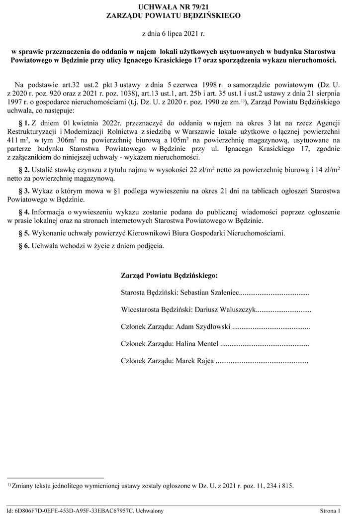 Nr 79/21 Zarządu Powiatu Będzińskiego