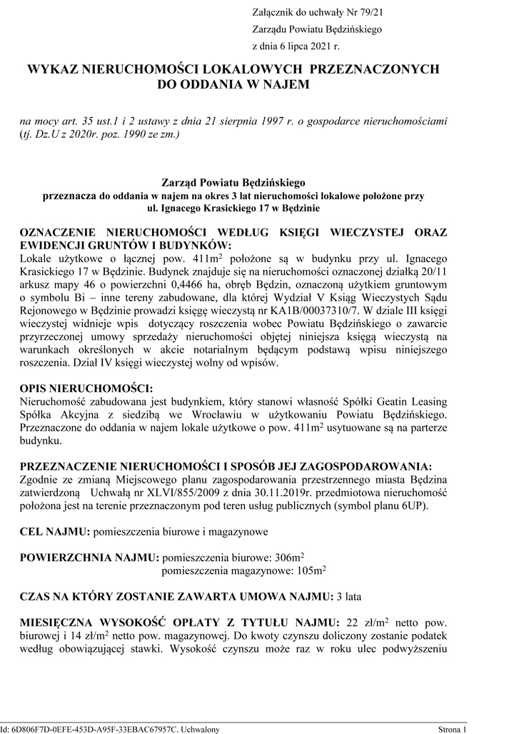 Lokale użytkowe o łącznej pow. 411m2 położone są w budynku przy ul. Ignacego Krasickiego 17 w Będzinie. Budynek znajduje się na nieruchomości oznaczonej działką 20/11 arkusz mapy 46 o powierzchni 0,4466 ha, obręb Będzin, oznaczoną użytkiem gruntowym o symbolu Bi – inne tereny zabudowane, dla której Wydział V Ksiąg Wieczystych Sądu Rejonowego w Będzinie prowadzi księgę wieczystą nr KA1B/00037310/7. W dziale III księgi wieczystej widnieje wpis dotyczący roszczenia wobec Powiatu Będzińskiego o zawarcie przyrzeczonej umowy sprzedaży nieruchomości objętej niniejsza księgą wieczystą na warunkach określonych w akcie notarialnym będącym podstawą wpisu niniejszego roszczenia. Dział IV księgi wieczystej wolny od wpisów.