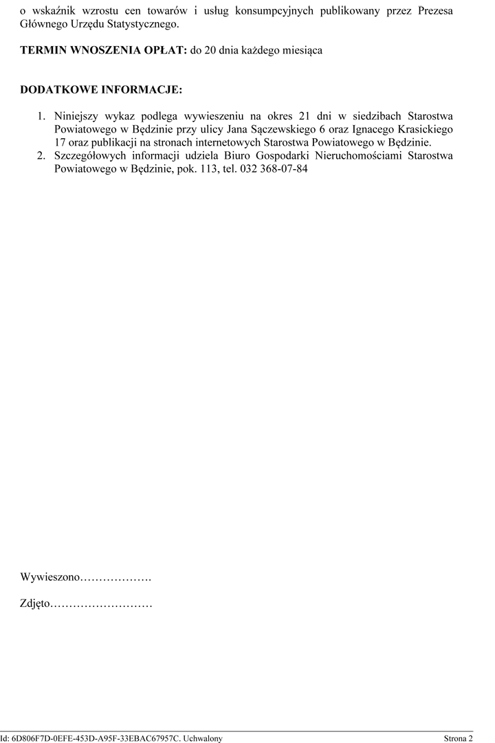 Niniejszy wykaz podlega wywieszeniu na okres 21 dni w siedzibach Starostwa Powiatowego w Będzinie przy ulicy Jana Saczewskiego 6 oraz Ignacego Krasickiego 17 oraz publikacji w Biuletynie Informacji Publicznej www.bip.powiat.bedzin.pl. Ponadto wykaz podlega publikacji na stronie podmiotowej Wojewody Śląskiego w Biuletynie Informacji Publicznej przez okres 21 dni.