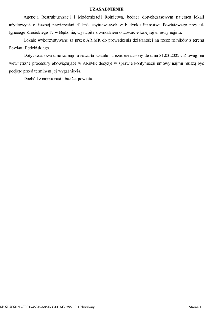 Agencja Restrukturyzacji i Modernizacji Rolnictwa, będąca dotychczasowym najemcą lokali użytkowych o łącznej powierzchni 411m2, usytuowanych w budynku Starostwa Powiatowego przy ul. Ignacego Krasickiego 17 w Będzinie, wystąpiła z wnioskiem o zawarcie kolejnej umowy najmu.