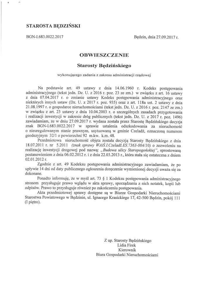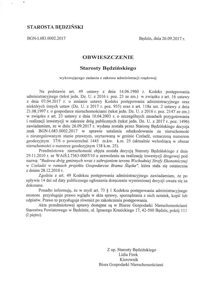 Wykaz tych nieruchomości wywieszono na 21 dni w siedzibach Starostwa Powiatowego w Będzinie przy ulicy Sączewskiego 6 oraz Krasickiego 17 (I piętro) oraz opublikowano w Biuletynie Informacji Publicznej www.bip.powiat.bedzin.pl. Ponadto wykaz podlega publikacji na stronie podmiotowej Wojewody Śląskiego w Biuletynie Informacji Publicznej przez okres 21 dni.