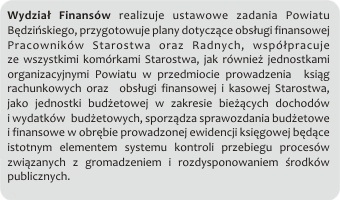 - prowadzenia ksiąg rachunkowych i obsługi finansowej Starostwa, jako jednostki budżetowej oraz Radnych w zakresie bieżących wydatków budżetowych;
