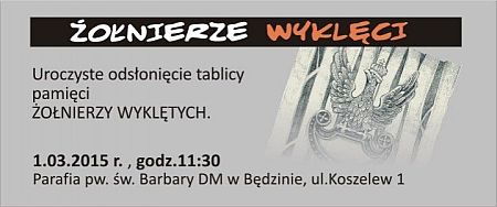 Starosta Będziński Arkadiusz Watoła, Poseł na Sejm RP Waldemar Andzel, Proboszcz parafii pw. św. Barbary DM w Będzinie, ks. kan Stanisław Sarowski serdecznie zapraszają mieszkańców Powiatu na uroczystości poświęcone pamięci Żołnierzy Wyklętych.