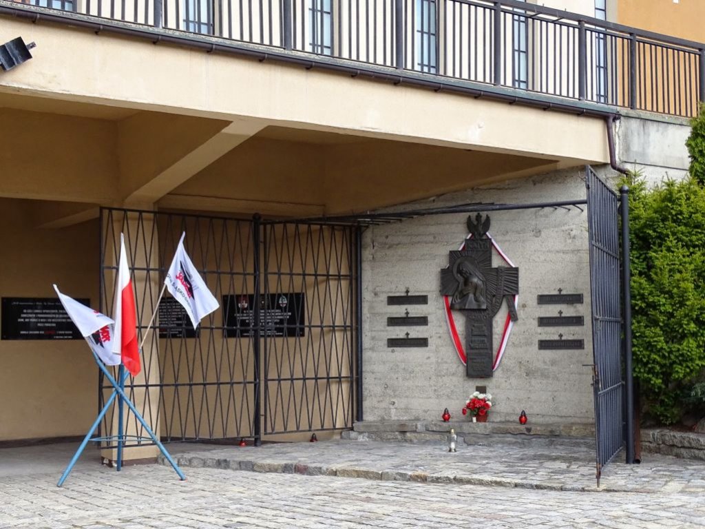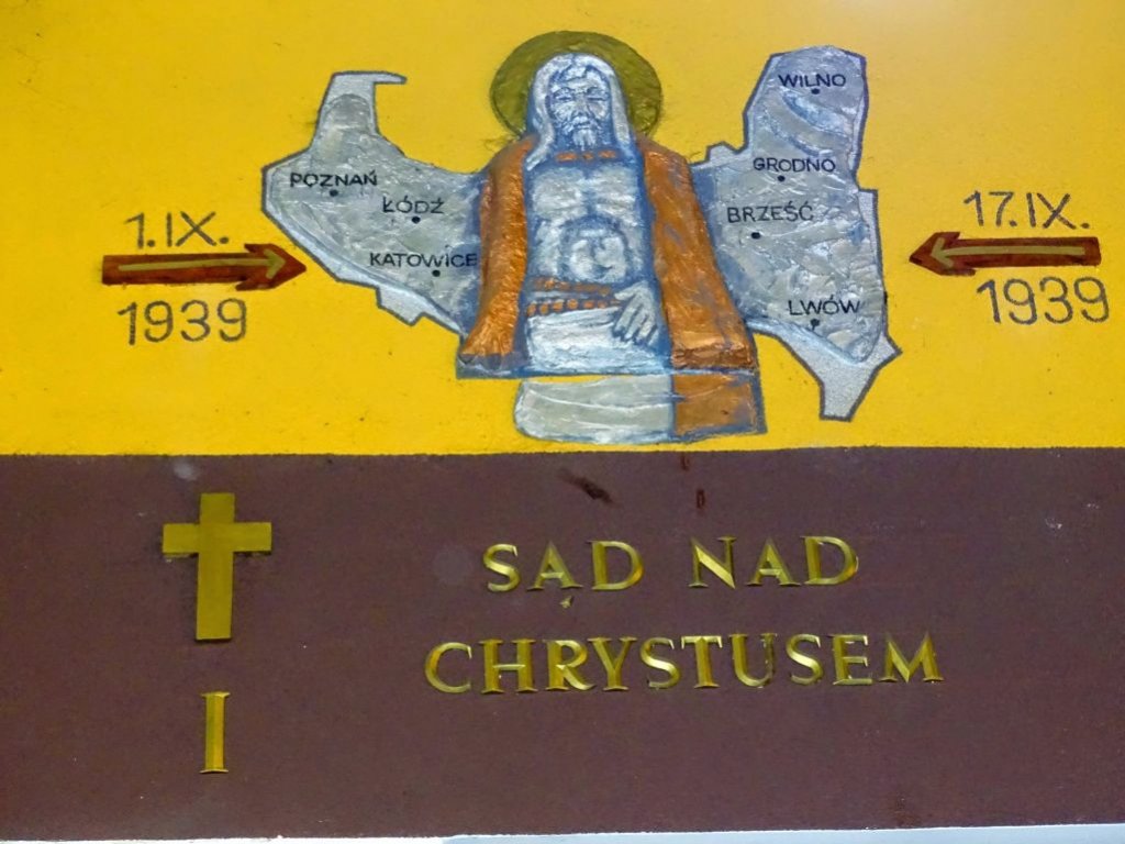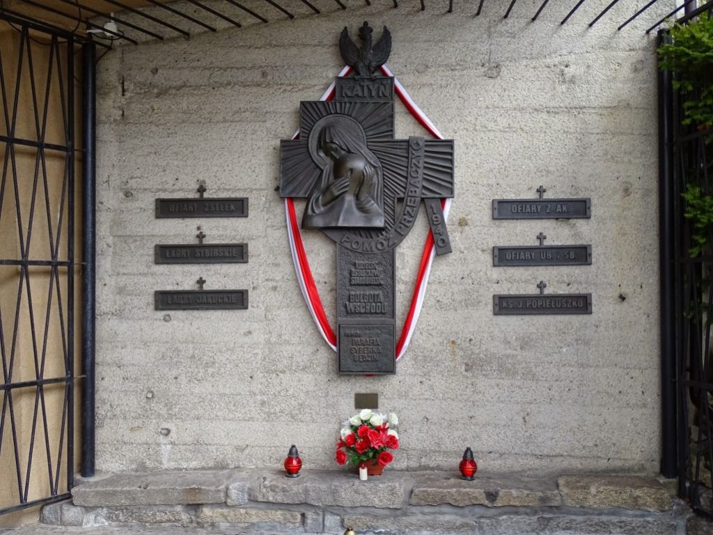 Przed wejściem do dolnej kaplicy znajduje się krzyż obrazujący Matkę Bożą Katyńską wraz z wypisanymi miejscami kaźni, zaś w środku dolnego kościoła znajduje się wspomniana wyżej Izba Pamięci. W środku wyeksponowano brzozowy krzyż z Matką Bożą Katyńską.