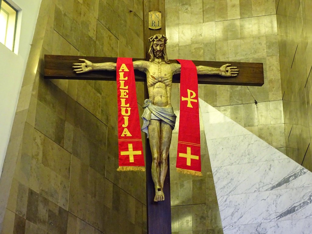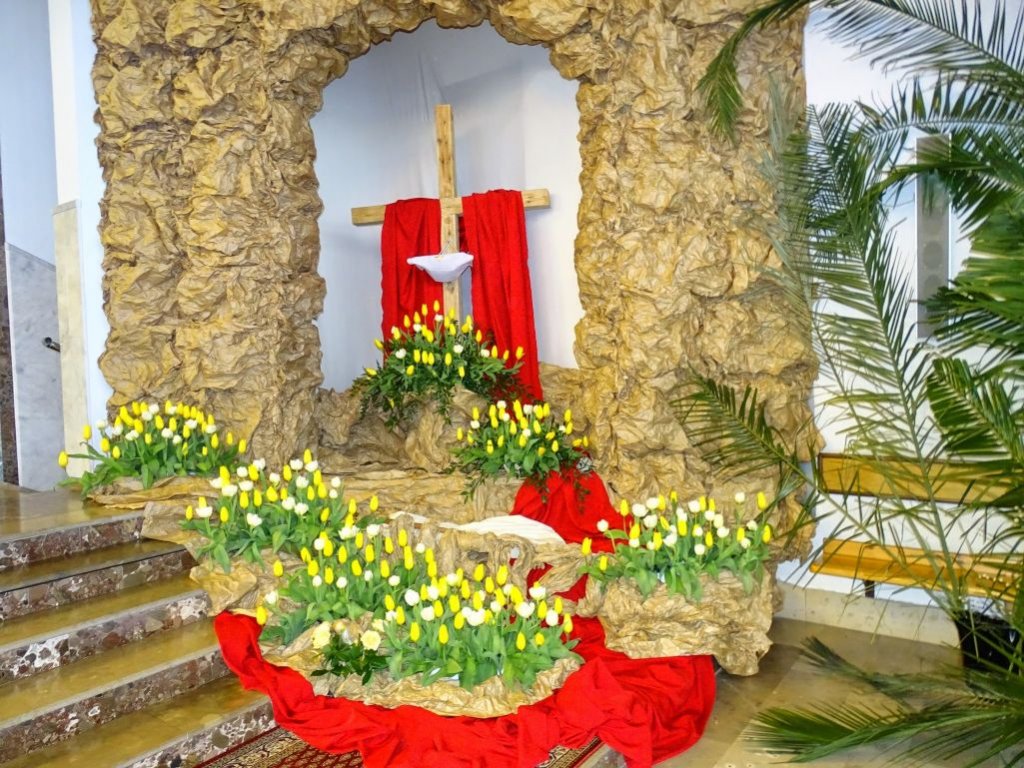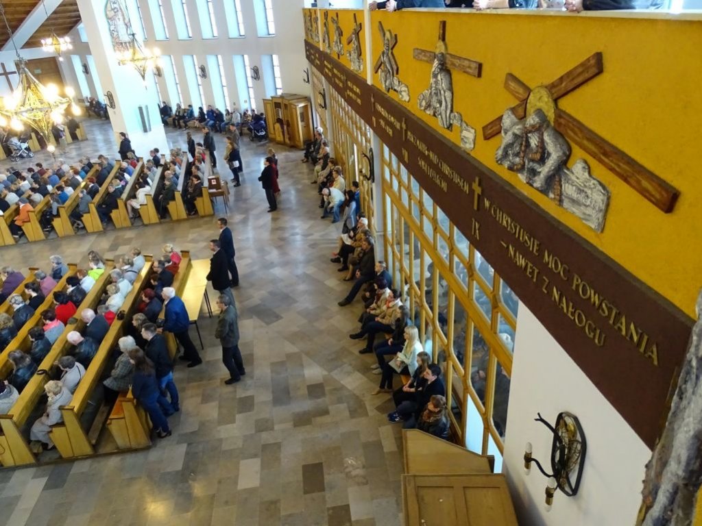 W prezbiterium górnej części kościoła został umieszczony krzyż z ponad trzymetrowym wizerunkiem Jezusa, na skrzydłach znajdują się dwie płaskorzeźby: jedna z nich to patronowie diecezji sosnowieckiej święty Brat Albert oraz święty Rafał Kalinowski, druga zaś to „Widzenie w katordze” według Artura Grottgera. Droga Krzyżowa, która swoje miejsca ma w tylnej części kościoła symbolizuje i jest zapisem męczeńskiej drogi Polski do wolności.